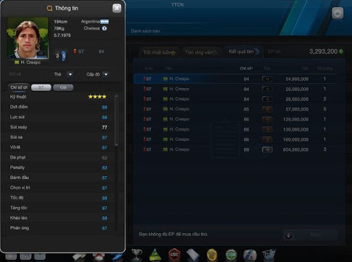 Nếu đang muốn tìm cho mình một tiền đạo hay, chất để xây dựng lên đội hình Chelsea FO3 thì không thể bỏ qua cái tên Crespo mùa WC06. Anh chàng này sở hữu chỉ số lên đến 84. Điểm mạnh của Crespo chính là dứt điểm 1 chạm, bứt tốc, đánh đầu. Song yếu điểm lại nằm ở những cú sút xoáy hay đá phạt, nên khi dứt điểm người chơi cần hạn chế dùng phím Z+D.