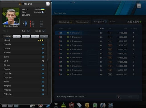 Tiền đạo Shevchenko trong đội hình của FO3 Chelsea sở hữu nhiều kỹ năng chuyên nghiệp như: Phá bẫy việt vị, dứt điểm, chọn vị trí, tốc độ, không chiến, sức mạnh cùng chỉ số cao….