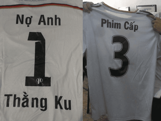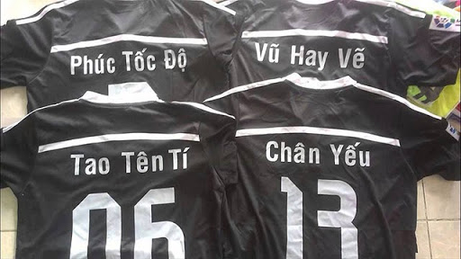 Những cái tên áo bóng đá hài hước, độc đáo nhất Việt Nam được in tên trên tạo ra những nét riêng biệt cho tính cách của từng người. Vậy bạn còn chần chờ gì mà không đặt những nickname cho tên áo bóng đá độc của mình. Ví dụ như: Lỗ Chí Thâm, Hải Bánh, Bình Sẹo, Long Sứt, Thảo Lép, Hòa Lắc, Lý Phèo…Đây được coi là dường như một trào lưu đặt tên áo bóng đá hay ho không bao giờ cũ đi của giới trẻ hiện nay.